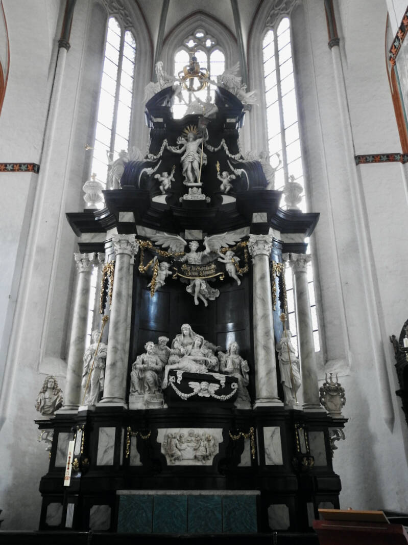 Lubeck werd getroffen in 2e Wereldoorlog door het eerste grote bombardement op Duitse steden. Hoewel de stad zwaar werd getroffen, zijn veel monumenten gespaard gebleven en viel de schade mee, zeker als je het vergelijkt met andere Duitse steden. Alleen de St Jakobikerk, die we gisteren al bezochten, bleef helemaal ongedeerd, maar bv de Dom werd wel getroffen evenals de Mariënkirche, beide stortten gedeeltelijk in maar zijn voortreffelijk weer gerestaureerd. In beide kerken zijn een groot deel van de originele inrichtingen en kerkschatten bewaard gebleven. Ongeveer 1/3 deel van Lübeck werd platgebombardeerd en is weer mooi herbouwd.