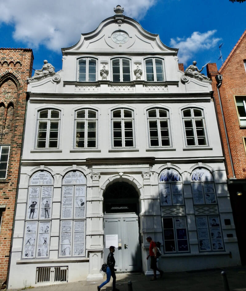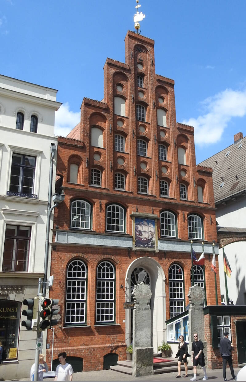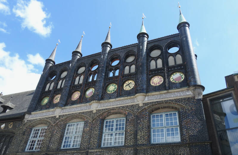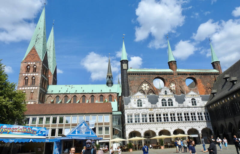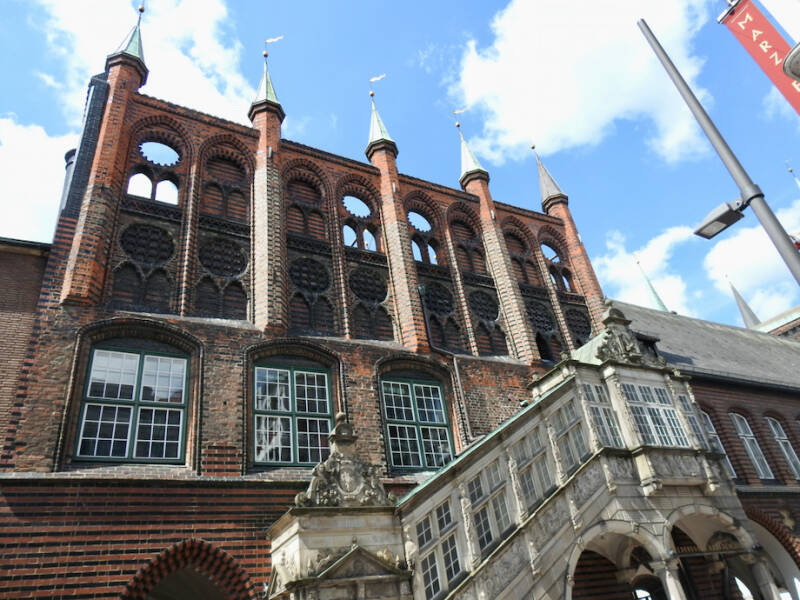 Vlak daarbij is het Rathaus (1226), wellicht het mooiste gebouw van Lübeck en het beroemdste stadhuis van Duitsland. De kant van de Breite Strasse , heeft niet alleen torentjes maar ook een doorgang naar het plein erachter met een mooi element boven een van de poortjes die naar het Rathaus plein gaan, onder het Rathaus door. Op dat plein zie je niet alleen de achterkant van het Rathaus maar ook de Mariënkirche die we overigens nog niet bezocht hebben, evenmin als de Dom. Jammer dat er dan een draaimolen en de kennelijk in Duitsland onvermijdelijke vreettentjes staan.