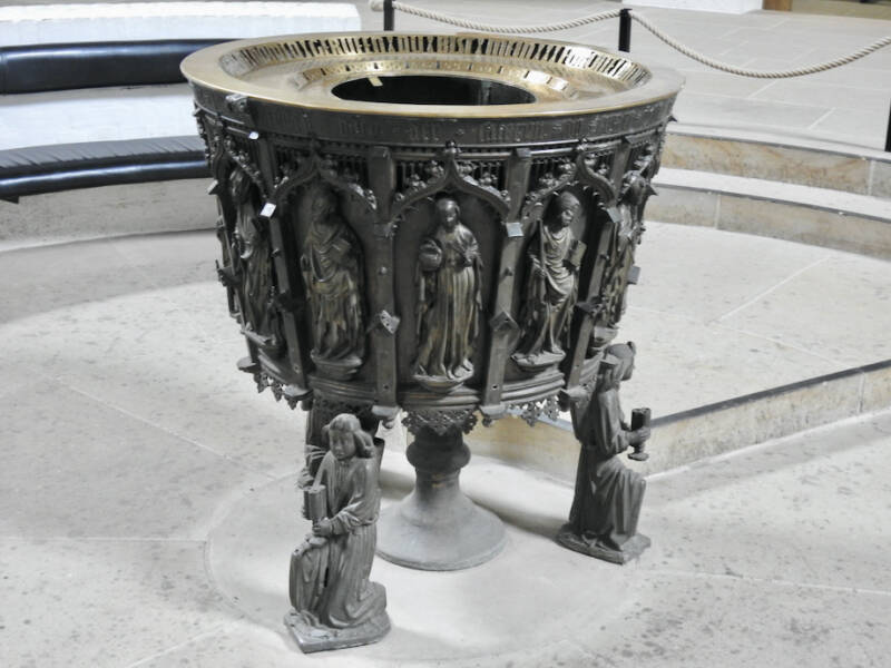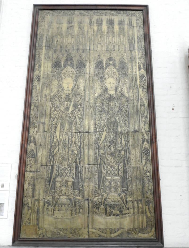 Rechts een messing gravure in de Dom, gerestaureerd. Uit de 2e helft van de 14e eeuw, gemaakt door ws meerdere Vlaamse meesters. Het is eigenlijk een grafplaat.