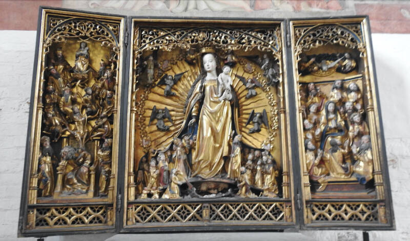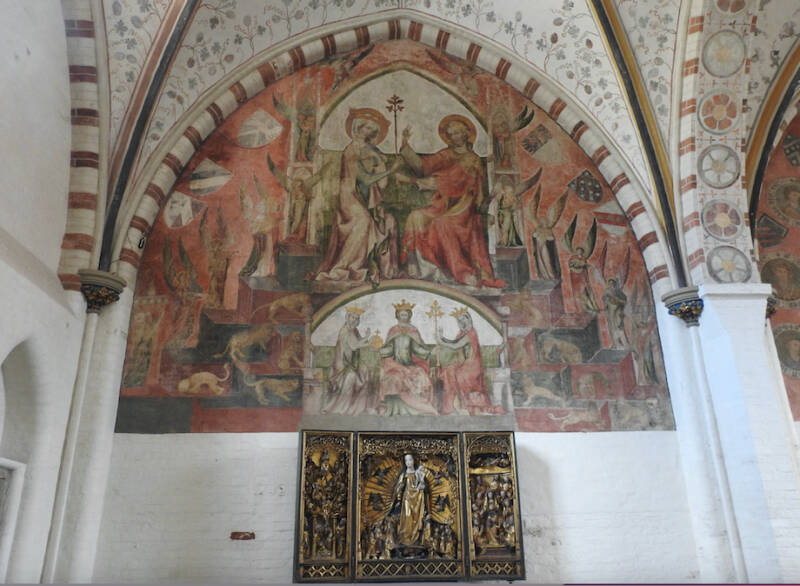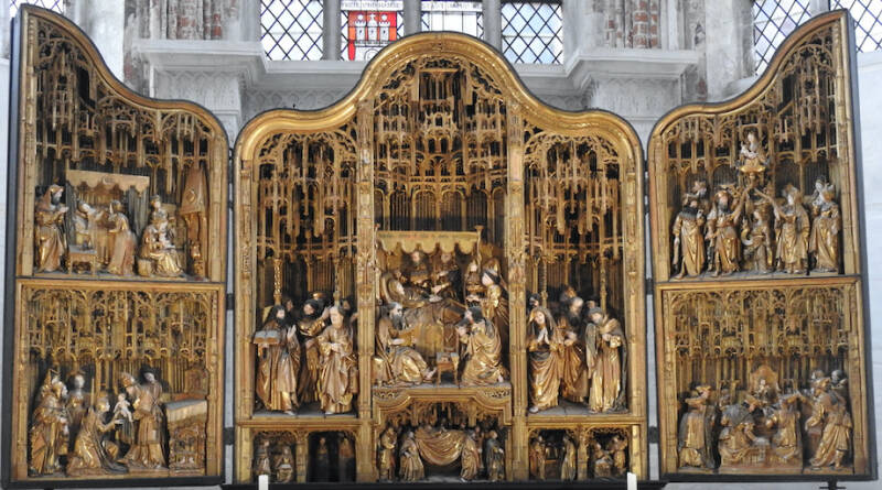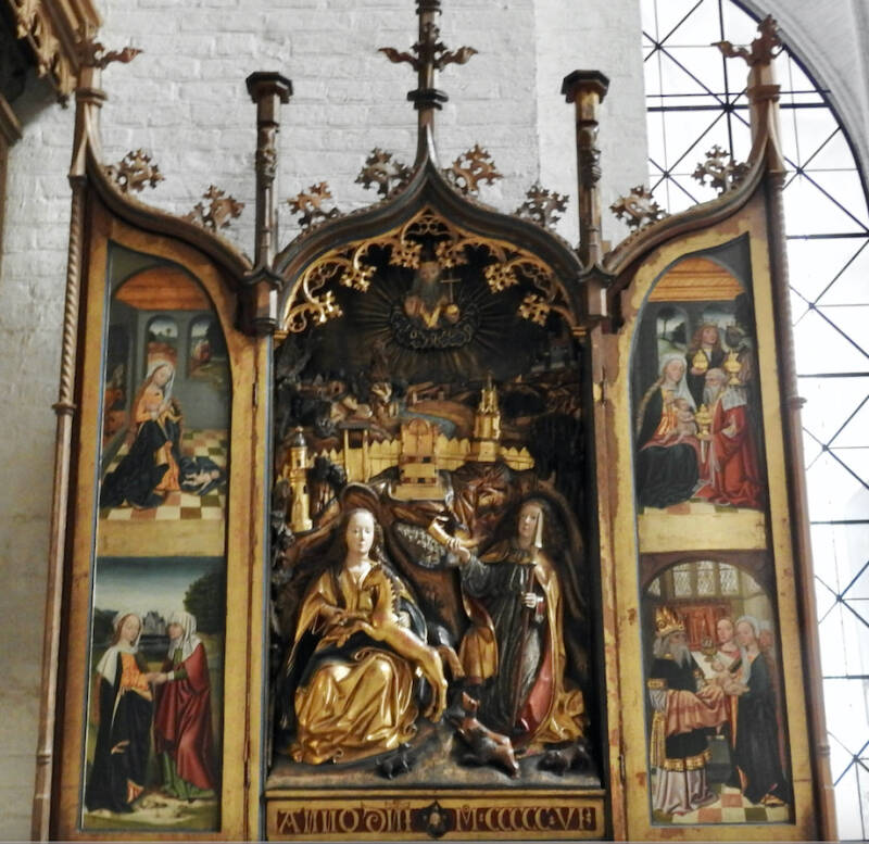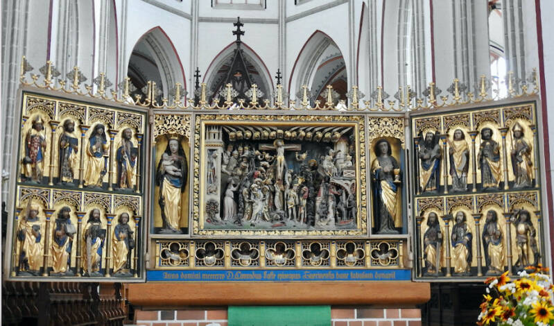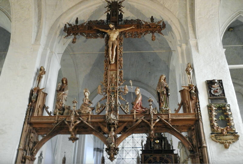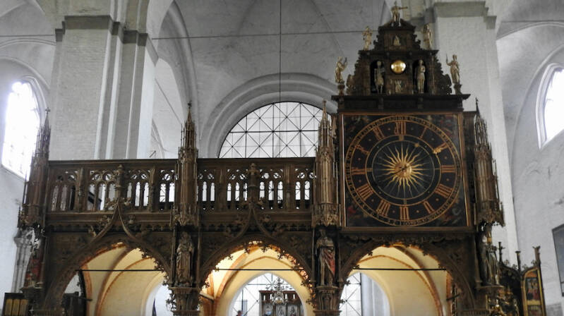 Mooi vinden we het vergulde drieluik uit 1476-1478, er zijn bijbelse en Maria taferelen op afgebeeld. Bizar de is dodendanskapel, met een dodendansorgel en gebrandschilderde ramen. Ook stond er een groot astronomisch uurwerk van na de oorlog, het oorspronkelijke werd nvernietigd door het bombardement.