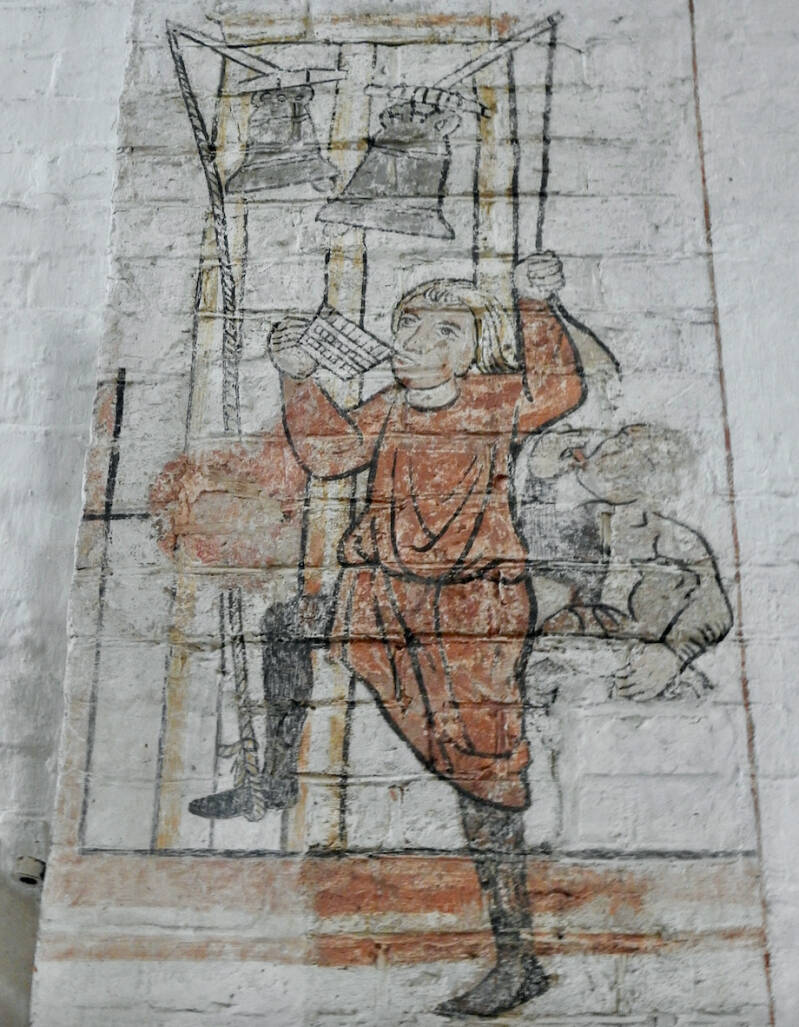 Muurschildering in de kerk, dit moet wel Tijl Uilenspiegel zijn. Naast de ingang van de kerk is een Uilenspiegel gedenksteen uit de 2e helft 16e eeuw