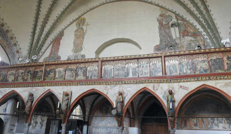 Via een straat met een aantal statige panden die uit rond 1900 dateren zijn we naar een werkelijk schitterend middeleeuws ziekenhuis gelopen, Heiligen-Geist-Hospital. Eigenlijk moeten we zeggen dat vooral het interieur schitterend is, met zijn fresco’s, 2 altaren , beelden en glas-in-lood ramen.