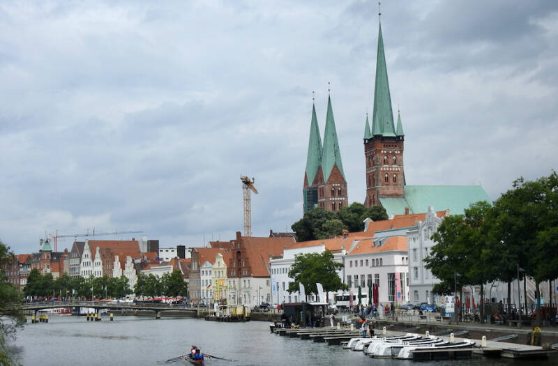Vanaf een bruggetje over de Trave zie je 3 van de 7 torens van Lübeck. Ook de huizen aan de kade zijn mooi.