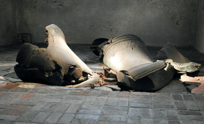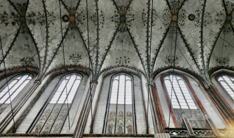We zijn weer teruggewandeld naar de Mariënkirche hoewel duidelijk evenals de Dom een protestants Gotteshaus, moesten we hier wel €4,- p.p. entree betalen. Als je binnenkomt valt het hoge plafond op , het is met 40m het hoogste gewelfde bakstenen plafond ter wereld. In de kerk is als een herdenken aan de beschadigingen die er in de oorlog zijn ontstaan, de neer beneden gestorte bronzen klokken als een soort monument blijven liggen.
