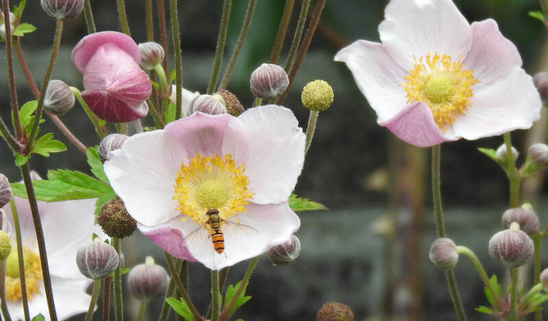 In de tuin staan weer andere bloemen in bloei dan toen we 3 weken geleden vertrokken. Op de bloeiende anemonen zit een snorzweefvlieg.