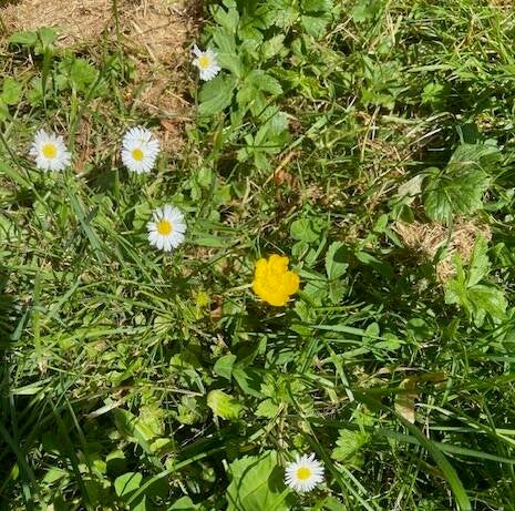 2 dagen geleden nog gieren gezien, nu staan er Madeliefjes en Boterbloemen in het gras bij de camper.