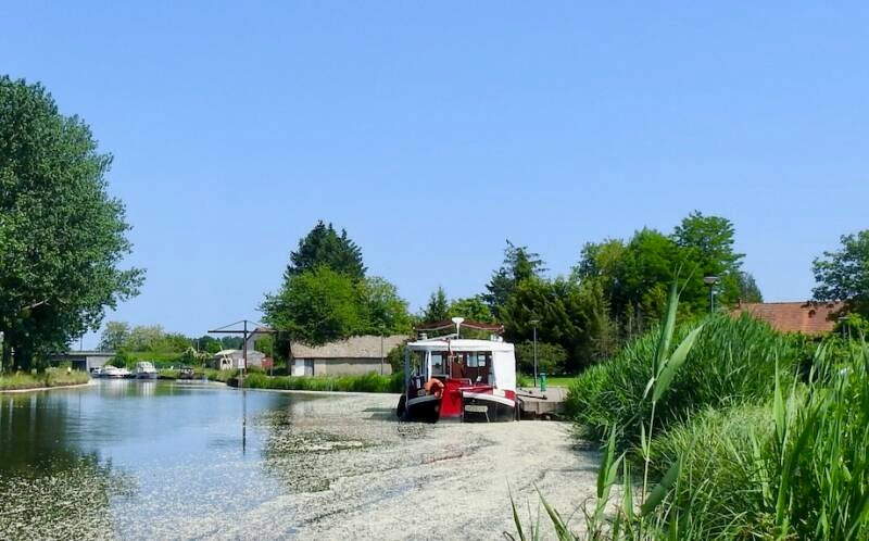 Het kanaal van Digoin naar Roanne bij Molinet, daar ligt de cp aan. Het wit op het water zijn bloemblaadjes.