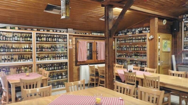 Omdat het ons bevalt om ’s middags als het mooi weer is te stoppen, hebben we vandaag ook maar 300 km gereden. We zijn via een klein stukje Duitsland net over de grens met België gereden, we staan in Rodt, niet ver van Sankt Vith. Er is daar in het bos een cp bij een biermuseum/restaurant. Nu is dat biermuseum in het restaurant, alle wanden zijn bedekt met vitrines met daarin ongeveer 4000 biersoorten uit een groot aantal landen, dat is dus het museum.
