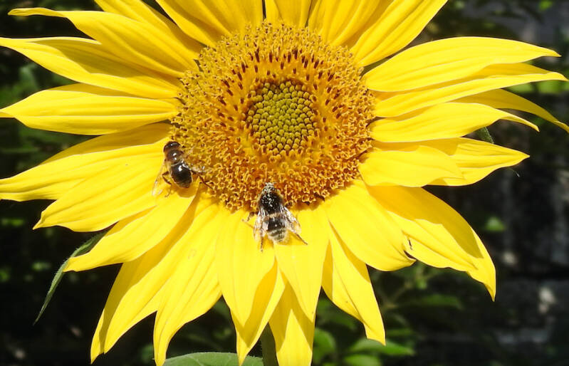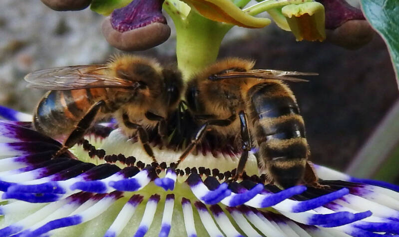 Het leek of deze honingbijen knuffelden op de passiebloem, duurde zeker 5 min. Via Toon(camperforum) weten we inmiddels dat het hier om een concurrentiestrijd om nectar gaat.