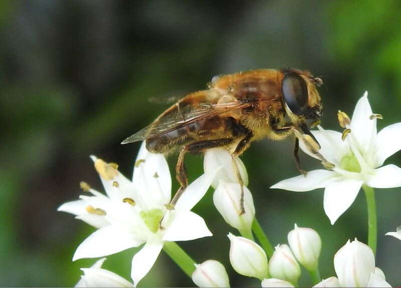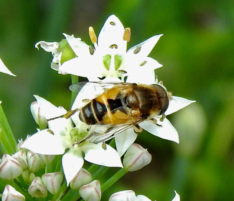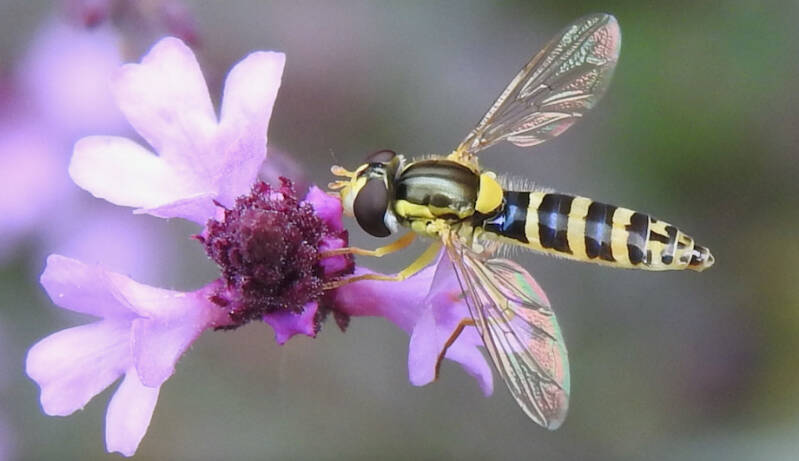 We hebben maar een kleine tuin, toch komen er veel insecten op de bloemen af. Zo hebben we 8 verschillende soorten zweefvliegen gefotografeerd, ze zien er vaak uit als wespen en variëren van heel klein tot groot.