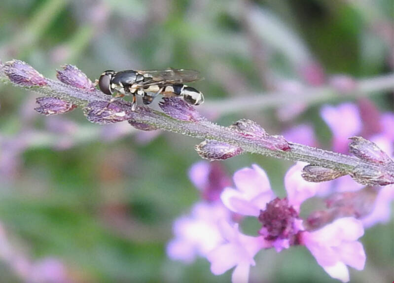 Vorige week een grote zweefvlieg, de Stadsreus. In de tuin hebben we ook heel kleine zweefvliegen, zoals hier de Grote Langlijf.(10mm) En het Kleine langlijfje zit doorgaans op dezelfde Verbena , deze is slechts 5 mm groot.(niet op de foto.)