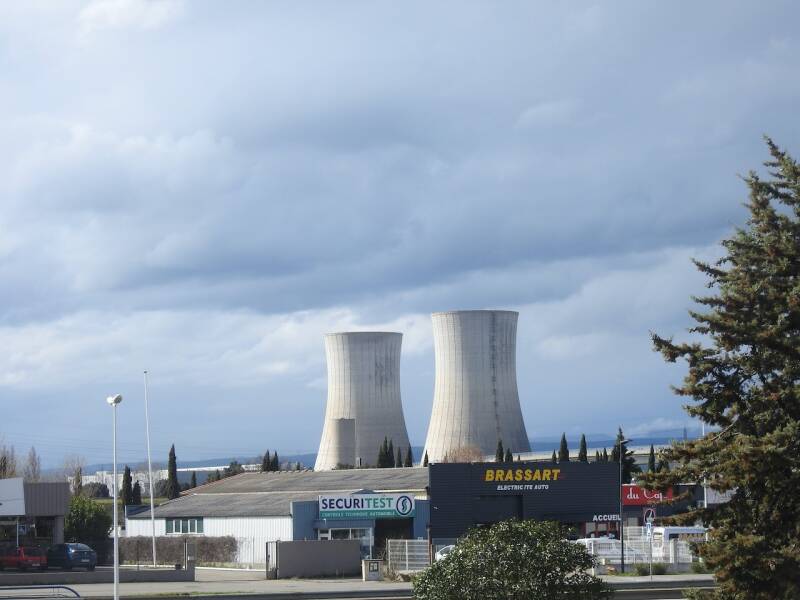 Het was druk maar het verkeer reed mooi door, af en toe een snelheidsbeperking tot 50 km. Het nadeel van niet meer door Lyon mogen rijden dat we nu niet meer het prachtige moderne gebouw ( een museum?) op de Rhôneoever kunnen zien als we de tunnels uitkomen. Ooit lag ongeveer op dezelfde plek een scheepswrak in de Rhône, het heeft er jaren gelegen, het zijn van die herkenningspunten als je jaren over de tolweg hebt gereden. Zo heb je ook de lange helling ‘Le Grand `Boeuf’ ( de grote os) waar we altijd moeiteloos langs de omhoog zwoegende vrachtauto’s zoeven. Net zoals de beide kerncentrales die dichter bij Bollène liggen en waarvan er een vlakbij de cp ligt waar we nu staan en die we vanuit het keukenraam kunnen zien. In de jaren ’70 waren we hier niet gaan staan, anti-kernenergieactivisten als we waren die o.a in Kalkar en Dodewaard gedemonstreerd hebben en ik nog vastgeketend heb gezeten aan het hek van de Urenco in Almelo. Dit is een fabriek waar laag verrijkt uranium wordt geproduceerd dat als brandstof voor kerncentrales wordt gebruikt. Inmiddels denken we wat genuanceerder over kernenergie.