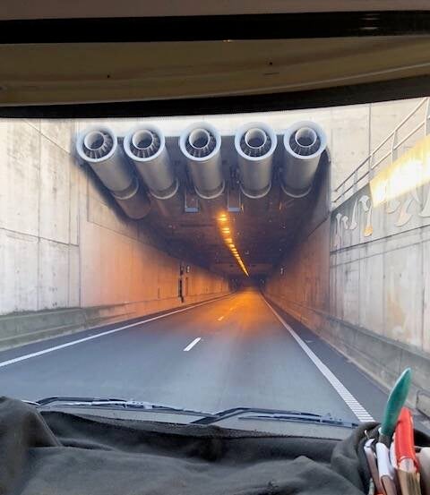De ingang van. de tunnelbuis bij Maastricht. Sinds een aantal jaren rijden we daar onder de stad door.