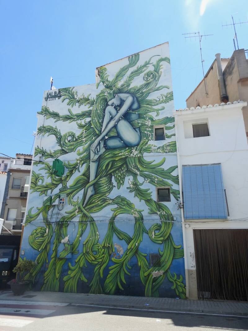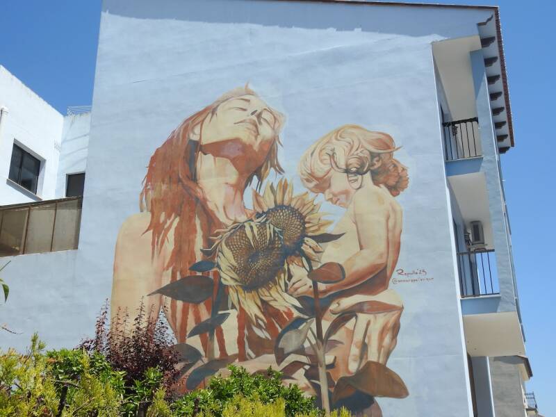 We hebben ons verkeken op het programma van vandaag van het gastro festival. We lazen dat er om 12.30 uur een quiz zou zijn, om 13.30 uur een demonstratie multicultureel koken en 14.30 uur een multiculturele maaltijd. Dat leek ons wel wat, dus togen we om 14.45 uur naar de stad, het begint toch altijd later. Komen we op het plein, zit er slechts een 20-tal mensen en het eten was bijna op. Dan gaan we maar in een restaurantje eten. Gisteren had ik wat last van zenuwpijn in mijn been en kon niet zo ver lopen, nu hebben we voordat we gingen eten in een ander wijkje nog wat foto’s van muurschilderingen gemaakt, ze blijven ons boeien. Komen we bij het restaurant, dezelfde als gisteren, een andere was gesloten, waren ze daar ook al aan het opruimen. En het was nog geen half 4, merkwaardig voor Spanje. Maar we konden toch noch wat te eten krijgen, ‘we sluiten wel over 20 min.’ Maar dat viel mee, we kozen nu voor tapa’s, 4 kabeljauwkroketjes, een 2- persoons portie patatas bravas en ten slotte 8 tortitas de camerones ( garnalenpannekoekjes) + een drankje. Het smaakte nog lekkerder dan gisteren en we moesten minder betalen, slechts €24,20 voor een goed gevulde maag.