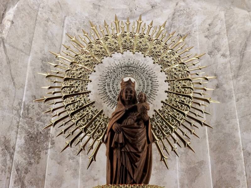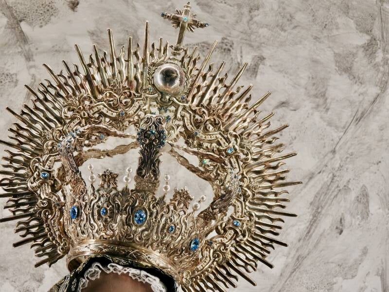 Geen idee hoe zo'n prachtige hoofdtooi van een vrouwelijk heiligenbeeld in de katholieke kerk heet.