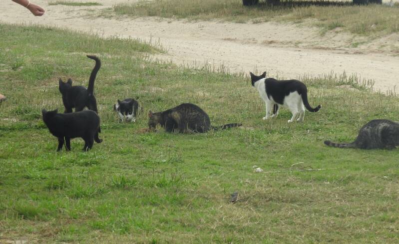 Gisteren hebben we het al over gehad over de 2 vaste bewoners hier, zo is er ook een vaste gewoonte. Er zijn hier nogal wat zwerfkatten, we telden er 13. Iedere morgen om een uur of 8 komen er een man en vrouw deze katten verzorgen, ze geven ze te eten en kijken ze na. Na een uur vertrekken ze weer, dat doen ze al jaren zo.