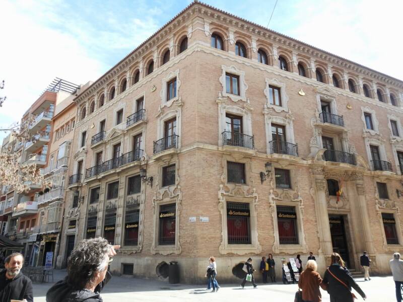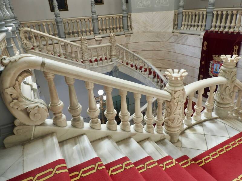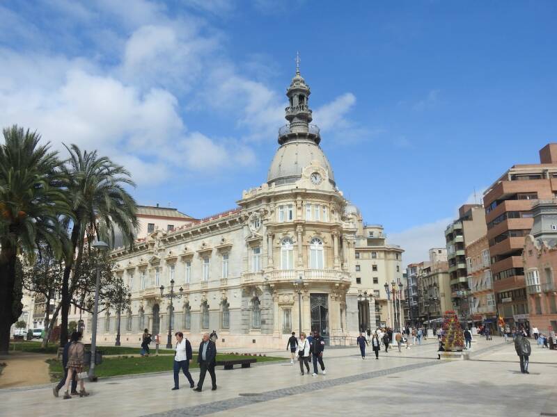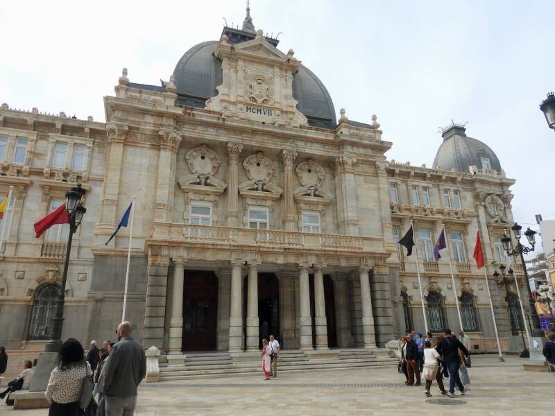 We zijn over de boulevard langs de jachthaven gewandeld naar het gemeentehuis, de Ayuntamiento. We kwamen nog langs een winkel van de licor 43, maar daar hebben we niets gekocht. Het gemeentehuis is gevestigd in het Palacio Consistorial in een eclectische (meerdere bouwstijlen) stijl gebouwd en doet erg Frans aan. Je kunt voor slechts €1,- een verplichte rondleiding krijgen door een enthousiaste gids. Via een monumentaal trappenhuis met veel modernistische invloeden kom je op de 2e verdieping. We kregen de plenaire zaal, de raadszaal en het burgemeesterskantoor te zien. Overal hangen schilderijen van notabelen uit vroegere tijden. De rondleiding was leuk, niet alleen omdat het zo belachelijk goedkoop was.
