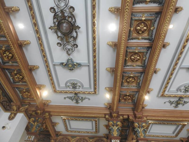 Door een van de belangrijkste straten kom je langs het oude casino waarin een herensociëteit is gevestigd. We waren daar al eens geweest en vonden het de moeite waard om die weer eens te gaan bezichtigen. Het gebouw dateert uit ongeveer 1850 De diverse kamers en gangen zijn in diverse bouwstijlen, je komt binnen door een kleine neo- barokke vestibule, vervolgens via de Arabische patio in een gang, de Galleria Central waaraan verschillende kamers zijn gelegen, zoals de Biblioteca Ingles ( de Engelse bibliotheek, de Tocador de Señores en de wapenkamer. Beelden , replica’s van beroemde beelden gemaakt in het begin van de twintigste eeuw, staan in de Patio van Pompeï. De eerste verdieping is alleen toegankelijk voor leden van de sociëteit .