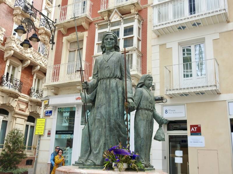 We konden nu langs de weg naar de bushalte lopen zonder nat te worden. De bus gaat naar het centrum, Plaza de España, voor €1,20 pp ben je er. Cartagena heeft vooral een historie als marinehaven en handelshaven. Er zijn niet zoveel bezienswaardigheden, de paar musea staan vooral in het teken van het marineverleden en de zeevaart, daar zijn we niet zo in geïnteresseerd. En dan blijkt het ook nog eens vaderdag te zijn, enkele musea waren gesloten. De stad heeft een aantal modernistische gebouwen en ook het Romeinse verleden heeft zijn sporen nagelaten.