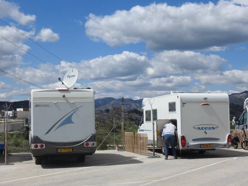 We hadden het vanmorgen bij de koffie er nog over dat we vorig jaar eind april gewekt werden om 6.30 door vrachtauto’s en personenauto’s die de cp kwamen oprijden: de citroenoogst was begonnen. En dat het een leuke cp was ondanks het feit dat je op asfalt stond bij het zwembad en sportvelden, wat ook weer wat reuring gaf trouwens. Dat buiten zitten geen probleem was i.t.t. veel andere cp’s in Spanje waar er regels gelden die dit verbieden. Maar wacht eens even, die cp waar we morgen naar toe gaan in Casas Nuevas, daar maken overwinteraars er een soort camping van tot ongenoegen van Spaanse camperaars. Is het wel zo verstandig dan,…..