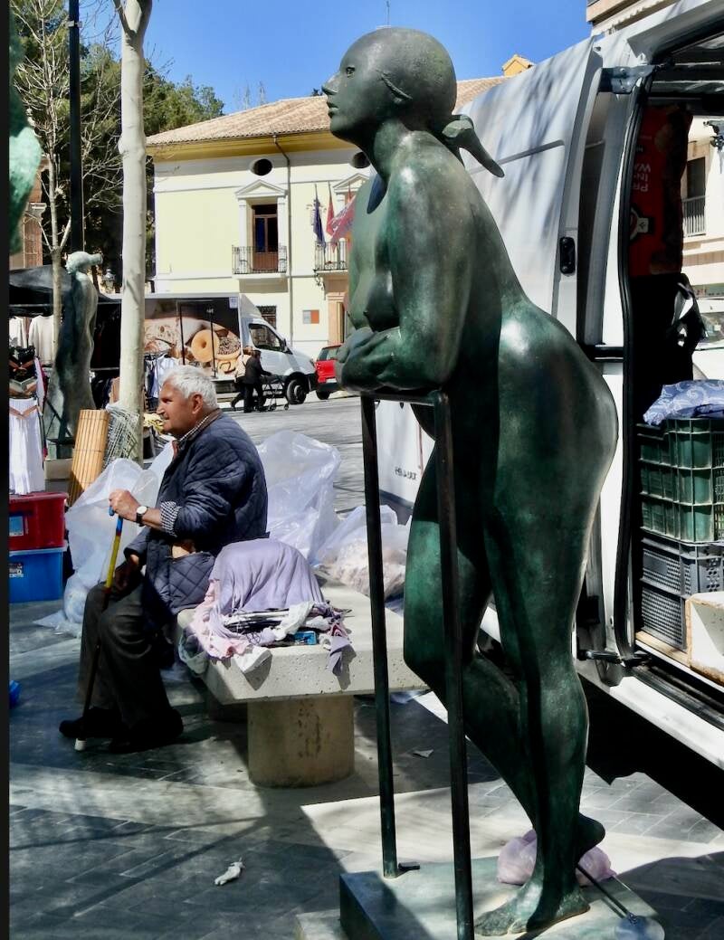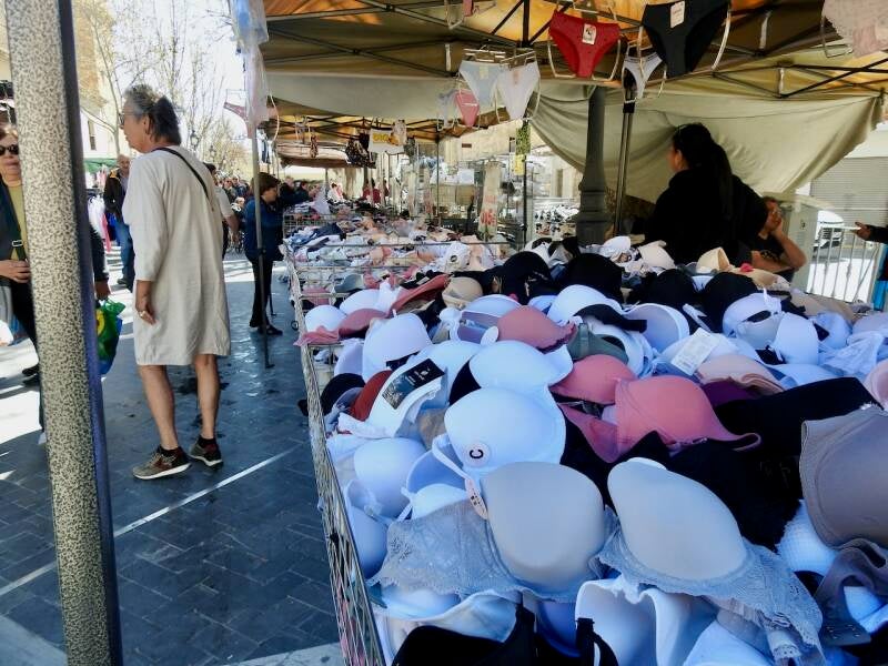 Er was vanmorgen markt, we hadden fruit nodig dus daar zijn we aan het eind van de ochtend heen gegaan. Een vrij grote markt en de schrik sloeg ons om het hart toen we meteen aan het begin  al rijen kraampjes zagen met bh’s en onderbroeken van Zeemankwaliteit.  Toch kwamen er kraampjes met andere kledij dan ondergoed en ook schoenen, weliswaar geen design maar leuker dan louter bh’s..  En warempel in een andere straat was de groente- en fruitafdeling waar we na enig zoeken zelfs een mooi ekip aan het spit konden scoren.