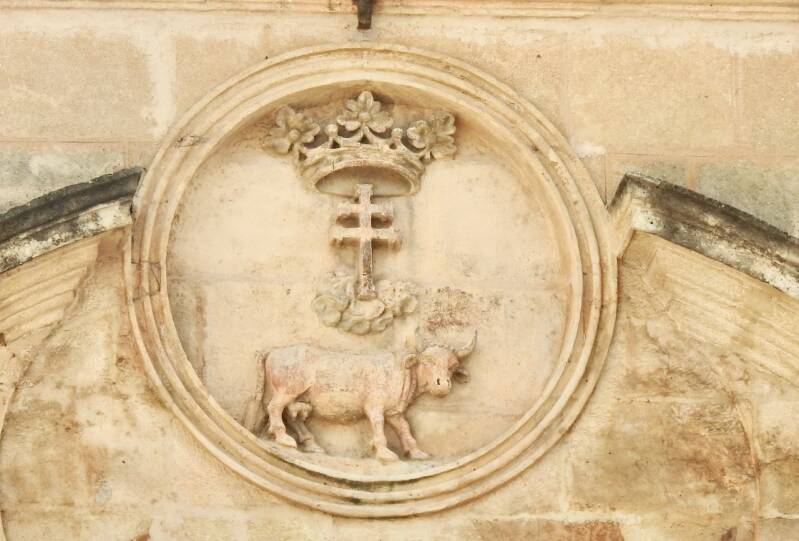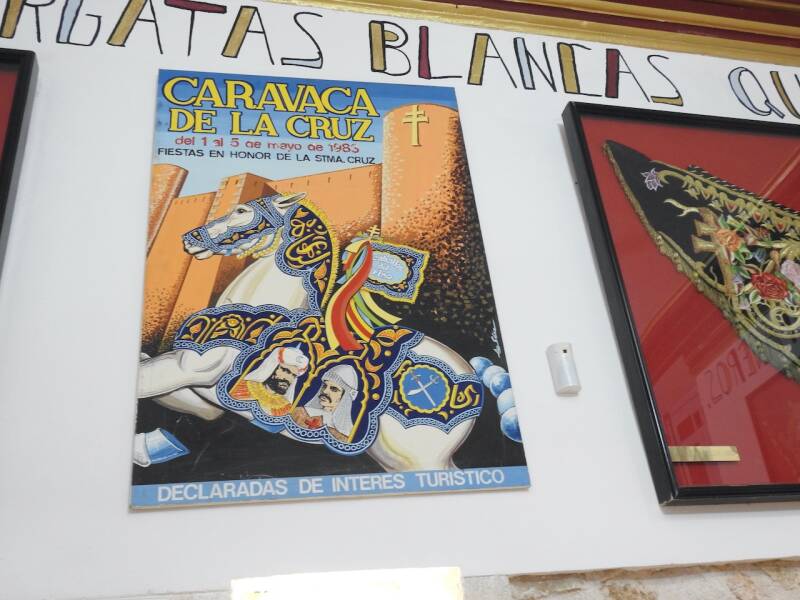Boven aan de gevel van het gemeentehuis het stadswapen van de stad Caravaca de la Cruz. Dat de La Cruz betekent van het kruis, Caravaca betekent het gezicht( kop?) van de koe. Onduidelijk waar dat Caravaca vandaan komt.