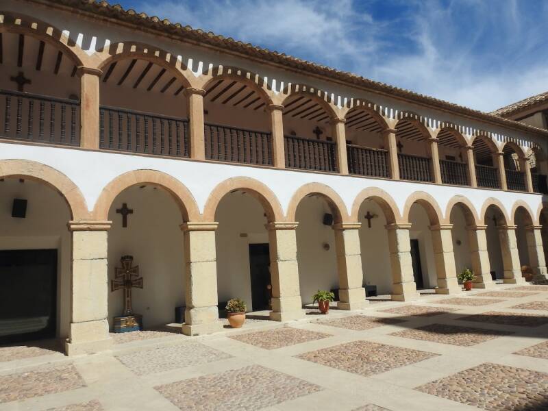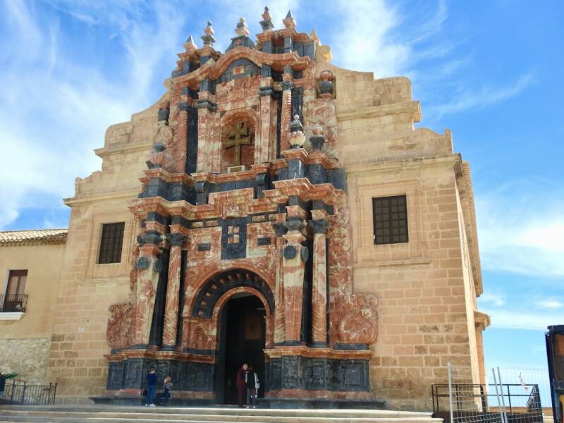 Sinds dat jaar 1232 is Caravaca de La Cruz, is een bedevaartsoord waar pelgrims naar toe wandelen en waar ook busladingen toeristen  arriveren. Er hangt  een replica van dat kruis in de basiliek, het origineel is verdwenen, net zoals het ooit verschenen is. Nadat we toch maar even de basiliek zijn binnen gegaan, verboden te fotograferen , dat heb ik niet gedaan, Everdien wel met haar mobieltje, kwamen we net op tijd weer buiten. Waren we in de basiliek vrijwel alleen, nu kwam er net een buslading toeristen aan, elke dag staan er hier op de parking bij de cp een aantal bussen.