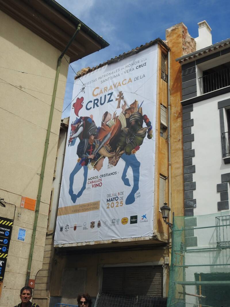 We staan in Caravaca de la Cruz , na wellicht het kortste ritje, nl 12 km , van deze reis. We zijn  3 jaar geleden in Caravaca de la Cruz geweest, op het feest van de  Los Caballos del Vino wat ieder jaar zo eind april, begin mei plaats vindt. Een prachtig schouwspel die paarden met de geborduurde kleden, ten dele ook spectaculair als de paarden, behangen met zakken gevuld met wijn, de heuvel waarop het kasteel ligt worden opgejaagd.