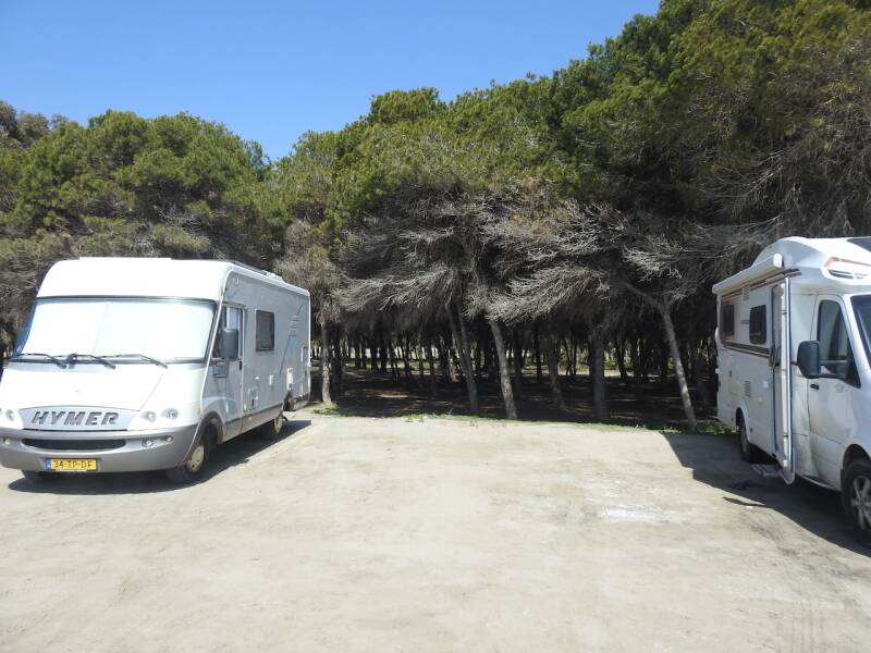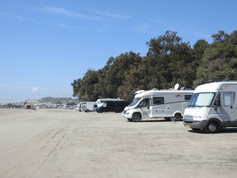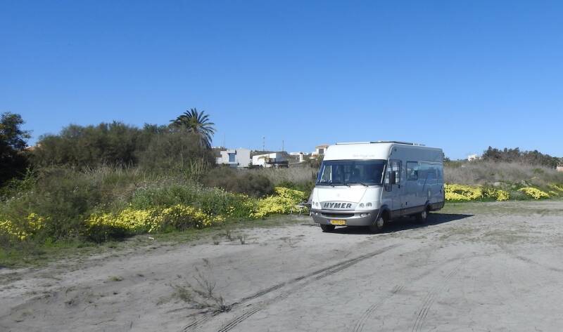 Er zijn een paar cp’s in de buurt die de mogelijkheid bieden om voor €4,- alleen te laden en te lossen, dus water innemen en grijs en zwart water( de toiletcassette ) te legen. Nu hebben wij dat nog niet meteen nodig want we hebben 2 cassettes bij ons. Maar dat die mogelijkheid bestaat zou wel eens de reden kunnen zijn dat het vrij staan hier langs de kust gedoogd wordt. De natuur blijft gevrijwaard van illegale stortingen en voor die paar euro kunnen camperaars weer een paar dagen vooruit.