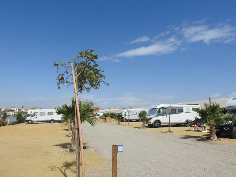 Vandaag hebben we ongetwijfeld de prijs in de wacht gesleept voor de kortste verplaatsing deze reis en wellicht van  de afgelopen jaren. Met zo’n klein stukje zal Polar Steps ook wel moeite hebben om die weer te geven op de kaart. We zijn nl naar het dorp Palomares gereden , een ritje van 1,5 km , naar een cp die nog gedeeltelijk in aanbouw is. Nee, we zijn niet naar Palomares gegaan om ooggetuigen te zoeken in het plaatselijke verzorgingshuis van de ramp met de B52 bommenwerper in 1966 maar om 2 andere redenen. Aan het eind van de ochtend zou de wind toenemen tot windkracht 5, wij vinden het dan niet aangenaam op het strand. Ten tweede moeten we hoognodig weer eens wassen, er is  een wasmachine op de cp.