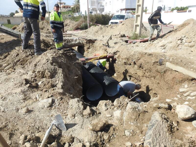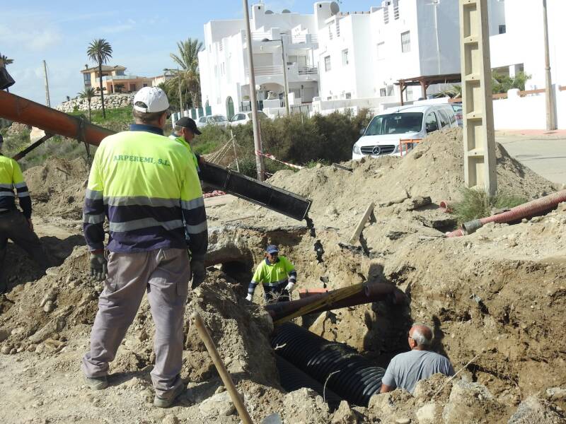 De cp waar we nu staan is in januari geopend. In februari stond de plek vol volgens de receptioniste. Toen begon het te regenen en op een gegeven moment is het helemaal fout gegaan tijdens zeer zware regenval, dat was toen in het nabijgelegen Aguilas de auto’s door de straten dreven. De toegangsweg naar de camping is toen weggeslagen, evenals een stuk van de weg ervoor. De mensen die op de camping zaten konden er niet meer af, de eigenaar heeft voor proviand gezorgd voor de mensen die vast zaten. Daarna heeft hij een noodweg aangelegd. Wij konden vanmorgen met moeite de cp vinden omdat de weg er naar toe voor een deel is afgesloten wegens herstelwerkzaamheden aan weggeslagen gedeeltes van de  weg. De cp bevindt zich nog in de opbouwfase. De ligging verdient geen schoonheidsprijs, we staan tussen kassen maar je ziet nog net een stukje van de zee die 10 min. lopen verwijderd is. Dus van zeezicht naar zicht op een zee van plastic.