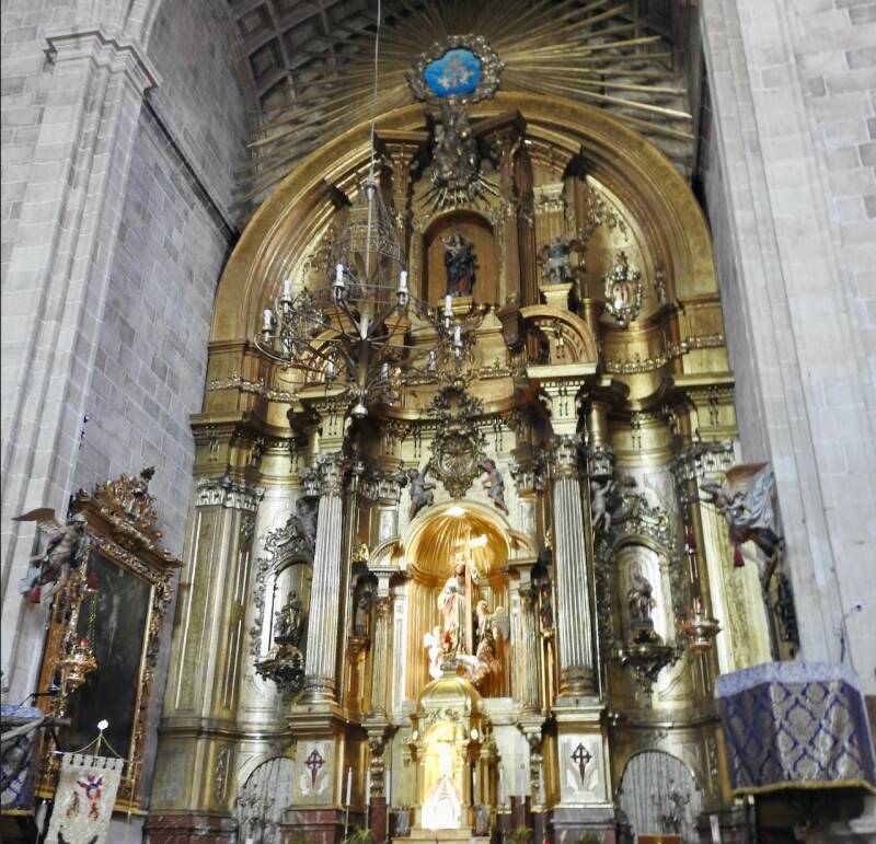We wilden vanmorgen naar het kasteel lopen, niet alleen voor de basiliek maar ook voor het uitzicht. Op weg daarheen kom je langs de Iglesia de El Salvador, daar hebben we eerst een kijkje binnen genomen. Daarna is het een kleine klim naar het kasteel waar we met name de basiliek Santa Cruz weer wilden bewonderen.  Niet van binnen, we geloven niet in (religieuze )wonderen. De basiliek heeft een prachtige barokke voorgevel van rood marmer. In de basiliek bevindt zich nl een replica va een kruis, dat volgens de overlevering als door een wonder in 1232 plotseling verlicht op een leeg altaar verscheen, dat moest toch wel een stuk van het heilige kruis zijn . Er werd net een mis opgedragen door een gevangen gehouden priester . Een berbervorst die dat zag werd meteen tot het christendom bekeerd.