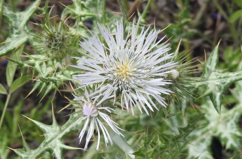 Een schitterende  distelsoort ,Galactites Tomentosa, de Paarse Mariadistel ,heeft 's winters een  zilverachtige bloem