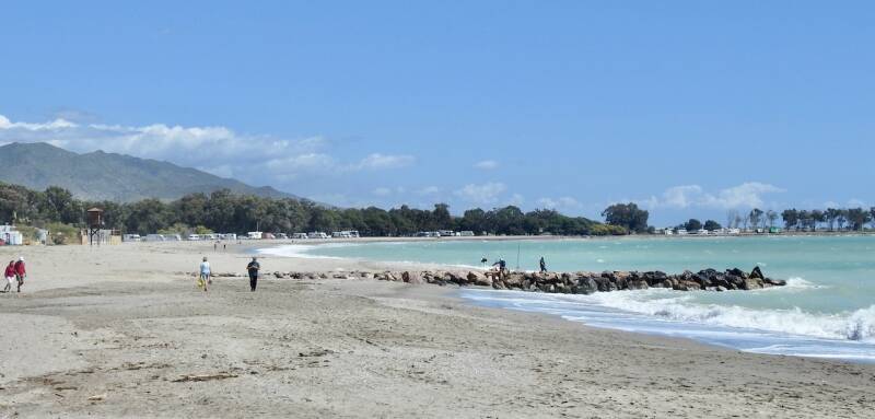 Wel wat anders dan de vele  Nederlandse campers die we de laatste week zijn tegenkomen toen we meer in het binnenland waren, afgelopen nacht  waren van de 12 campers er 7 Nederlandse. Waarom de Nederlandse campers daar in de meerderheid zijn , het zal te maken hebben met stedenbezoek en de Via Verde. Hoewel er hier ook een fietspad loopt, morgen maar eens gaan fietsen. Nu vooral gerelaxt en een stukje over het strand gewandeld. Er stond een matige bries van zee, zonnig en 20º. Als je een beetje in de luwte zat was  het heerlijk. Doe ons nog maar zo’n dag, wat heet dagen maar voor vrijdag wordt er veel wind voorspeld.