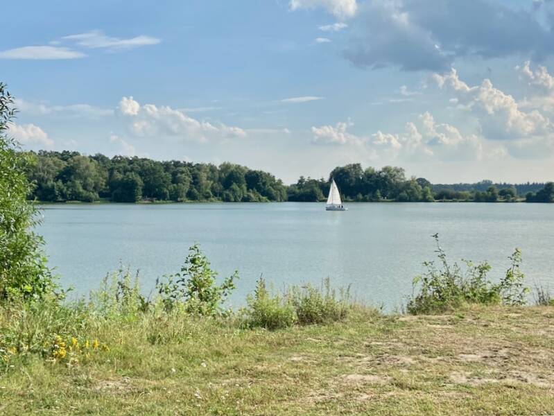 Dat was in Haselhünne toch wel anders, maar het meer blijkt op 5’ lopen afstand te zijn. Daar kun je mooi omheen wandelen, een wandeling van ongeveer 3km, dat hebben we aan het begin van de middag voor de lunch gedaan. Je komt dan vlak langs het dorp maar daar zijn we niet naar toe gegaan. Na de lunch hebben we er voor gekozen om te lanterfanten , lekker lezen bij de camper.
