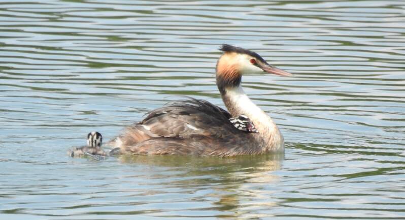 Een fuut met 2 jonkies, een zwemt er achter en de andere ligt in de nek.
