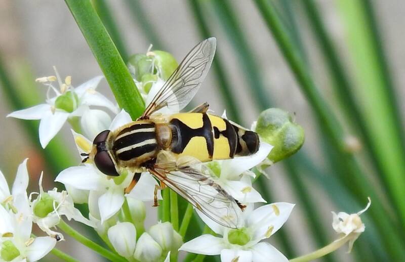 Citroenpendel(zweef)vlieg op de knflookbieslook in onze tuin