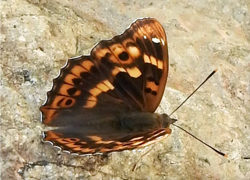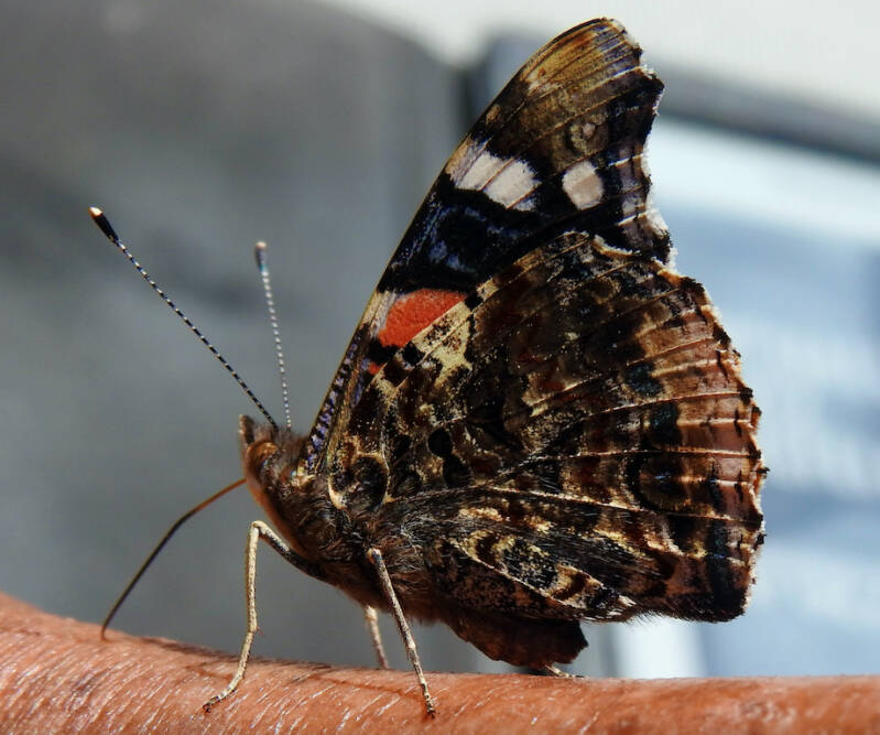 Een Atalanta, niet bijzonder zou je zeggen ,ware het niet dat hij vanochtend ruim een uur om ons heen fladderde en telkens landde op een van onze ledematen, vooral die van mij, om zout te likken. En ik ben kennelijk de schaamte voorbij om mijn sterk vergrote 75-jarige gerimpelde been te tonen.