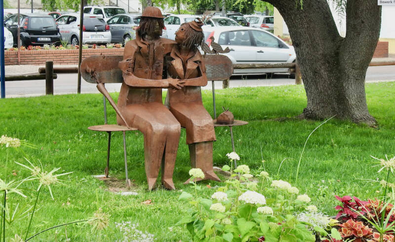 Het dorp stel niet heel veel voor maar heeft een paar aardige huizen en karakteristieke elementen. Er is een mini supermarkt en er is een café met een terrasje, met 33º smaakt een witte wijn voor Everdien en een pils voor mij heerlijk verkwikkend.