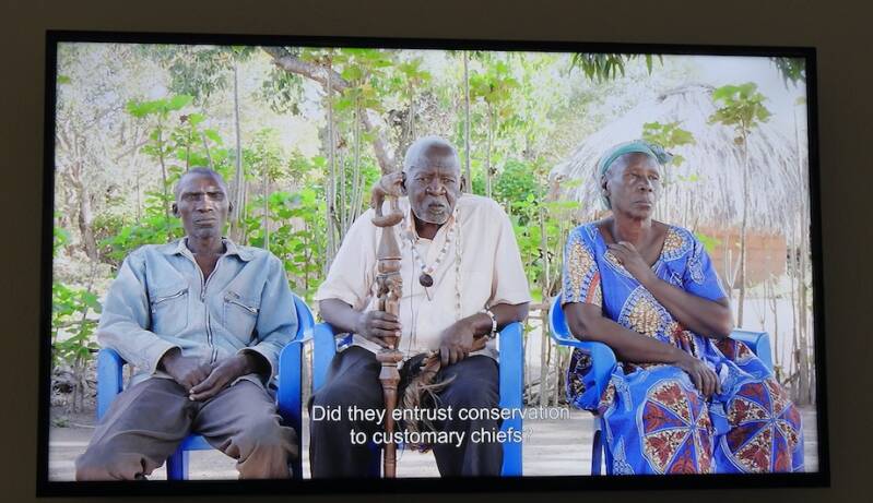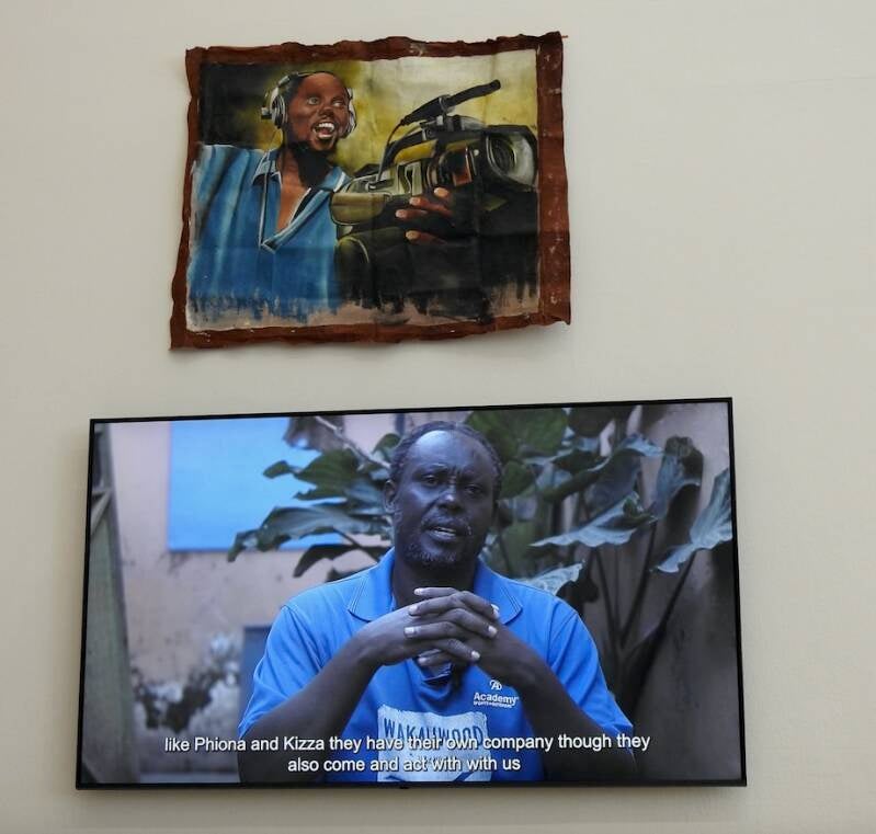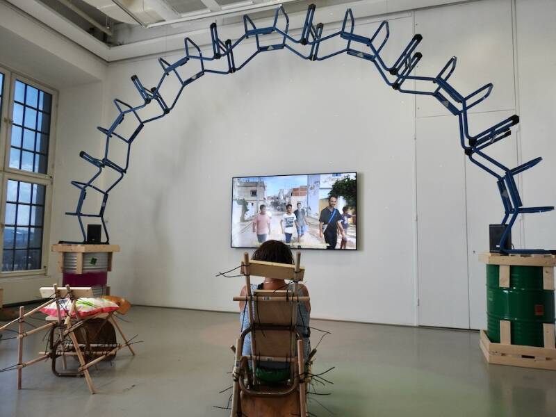 Kijken naar een film vanuit een stoel die vertelt hoe kunstenaars oa die stoel gemaakt hebben.