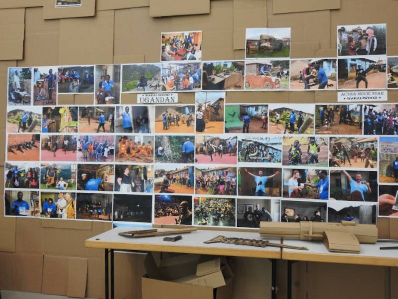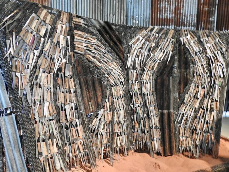 Kunstenaarscollectief uit Nairobi heeft de Documentahalle bekleed met golfplaten en een toegangsgebouwtje dat geïnspireerd is op Masai woningen.