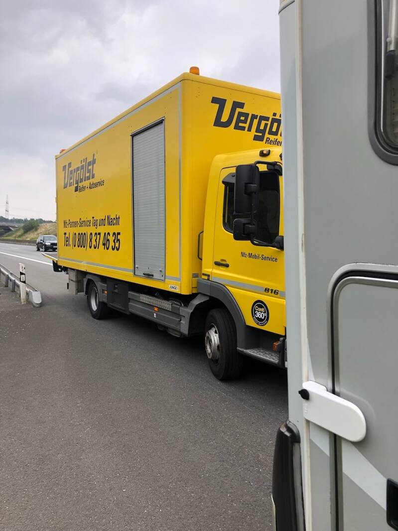 Het was niet al te druk, wel waren er regelmatig treintjes vrachtauto’s die te zacht reden naar onze zin, wij vinden zo rond de 90km tegenwoordig wel een mooie snelheid. Na het passeren van zo’n treintje reden we weer keurig 90km, gelukkig maar: een harde klap, we konden de camper mooi laten uitrollen de vluchtstrook op. Een flitsgedachte het is de as, maar we hadden een klapband en dat bij een band die nog geen 500km had gereden. Geluk bij een ongeluk was dat we vlakbij een praatpaal stonden en toen ik een klein stukje verder had gereden stonden we veilig bij die paal. Gele hesjes aan , gevarendriehoek geplaatst en gebeld via de paal. Bent U lid van de ANWB, prima we sturen de ADAC. Na niet te lang wachten kwam er een truck met een lepel, maar daar kan een camper niet op met een lekke achterband . Ondertussen ook contact gehad met de ANWB zodat er een dossier gemaakt kon worden en de ADAC wilde zeker weten dat ze door de ANWB gedekt waren in de kosten. De man van de ADAC belde een bedrijf die ter plekke de band kon verwisselen voor een andere, het wachten op dat bedrijf duurde wat langer maar het karwij zelf was zo gepiept. Het is een gespecialiseerd bedrijf die ook vrachtauto's met lekke banden helpt langs de Autobahn.