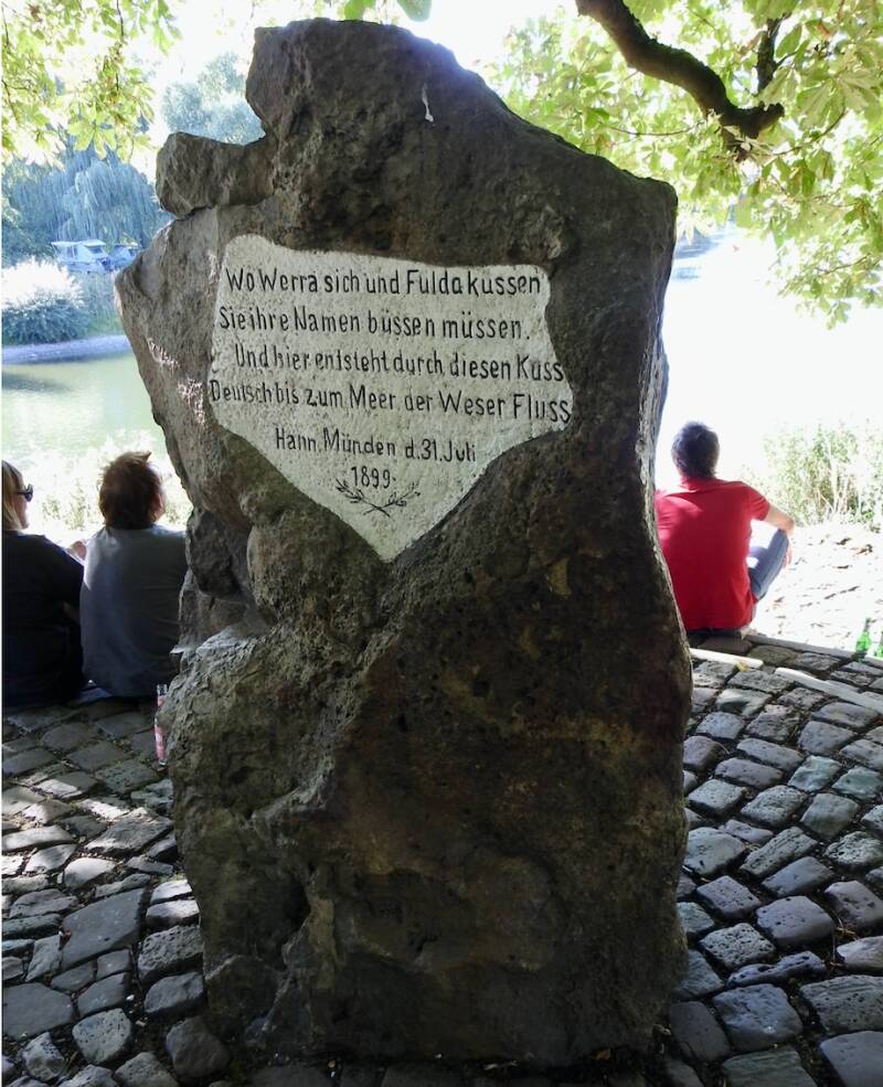 Er was nog plaats genoeg op de cp, we hadden het drukker verwacht, het is dan ook niet de mooiste cp , op een mix parking. Wij staan op het gedeelte voor de personenauto’s omdat we daar ’s middags schaduw van een boom hebben. Gelijk de app ParkByPhone gedownload, anders moesten we met munten betalen, nu kan het met de iPhone. De parking ligt aan het punt waar de rivieren de Fulda en de Werra zich verenigen en verder stromen als de Weser. Naar dat punt komen toeristen kijken hoewel er niet veel bijzonders te zien valt , er staat een gedenksteen uit 1899 met een gedicht.
