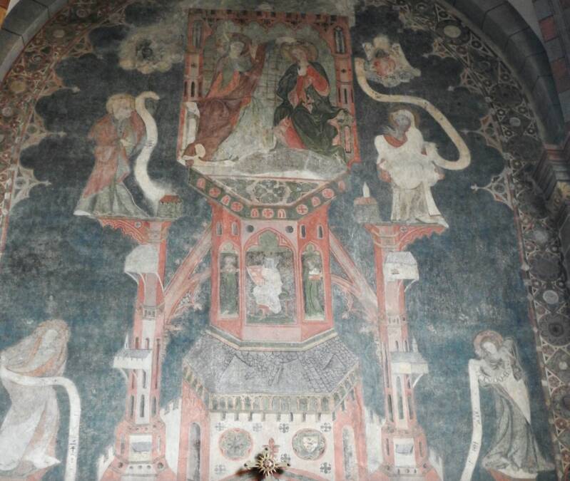 We zijn het ommuurde stadje ingewandeld, gelegen op een heuvel, ongeveer 20 min. lopen vanaf de cp. Dan denk je we zullen het nu wel gezien hebben al die vakwerkhuizen maar dit stadje heeft weer een heel eigen karakter. Wel weer een prachtig plein met goed gevulde terrasjes, de zondag zal daar aan bijgedragen hebben. Er is een kerk, ooit nog gesticht door St Bonifatius die bij Dokkum werd vermoord zoals iedereen nog wel weet. De kerk werd later, in de 11e eeuw verbouwd in een laat-romeinse stijl en werd toen de dom ( toen de bisschop erin ging zetelen) St. Petrus. Er moeten nog middeleeuwse schatten in de kerk te bezichtigen zijn maar Everdien was een mondkapje vergeten en die wordt hier op prijs gesteld.