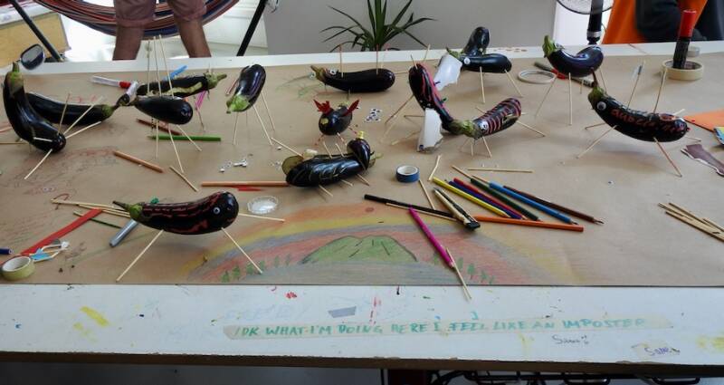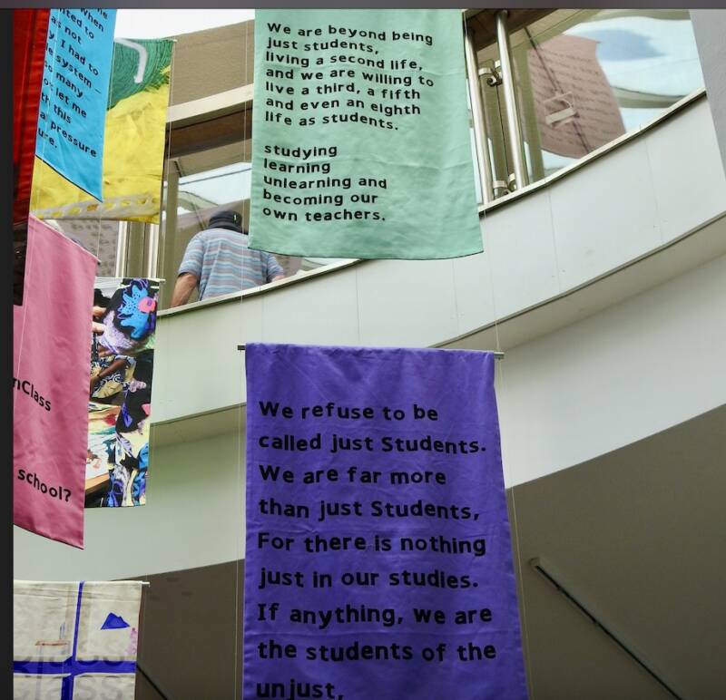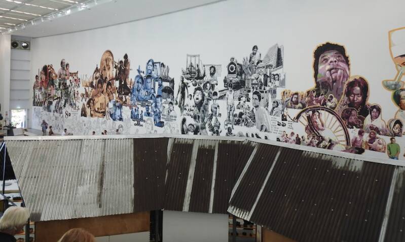 Ruangrupa heeft als uitgangspunt gekozen voor Lumbung. Een lumbung is een gemeenschappelijke rijstschuur waar iedere boer het overschot van zijn oogst heen brengt om te verdelen onder dorpsgenoten, het collectiviteitsbeginsel . Ruangrupa heeft kunstenaars en collectieven van over de wereld uitgenodigd om te werken aan lumbung door duurzaamheid en collectiviteit als kunst te tonen. Het gevolg is wel een allegaartje waarbij het voor ons soms moeilijk was om dat uitgangspunt te ontdekken . We zagen politieke uitingen, oral history, pamflet-achtige uitingen , archief-achtige presentaties , veel teksten op de muren bv in het museum Fredericianum.
