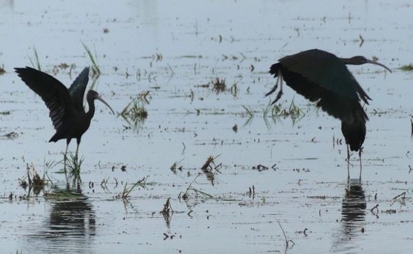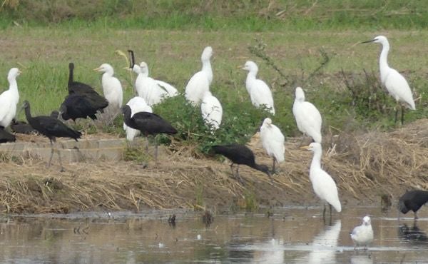We zijn vanmorgen bij zee vertrokken omdat er dikke sluierbewolking was en er vanmiddag mogelijk een bui kon vallen. Vlakbij Riomar zagen we zwarte ibissen maar helaas konden we daar niet stoppen . We zijn eerst 13 km terug gereden naar Deltebre om boodschappen te doen en om langs de serviceplek te rijden.