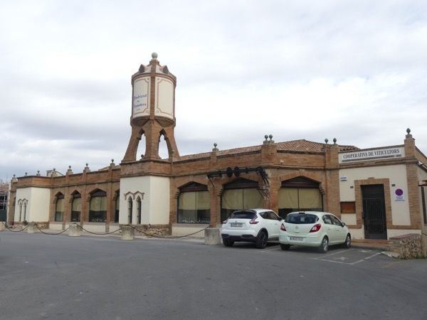 in de schaduw het dorp Peñarrroya de Tastavins met op de voorgrond de grote agrarische loodsen die de keuterboeren hebben verdreven